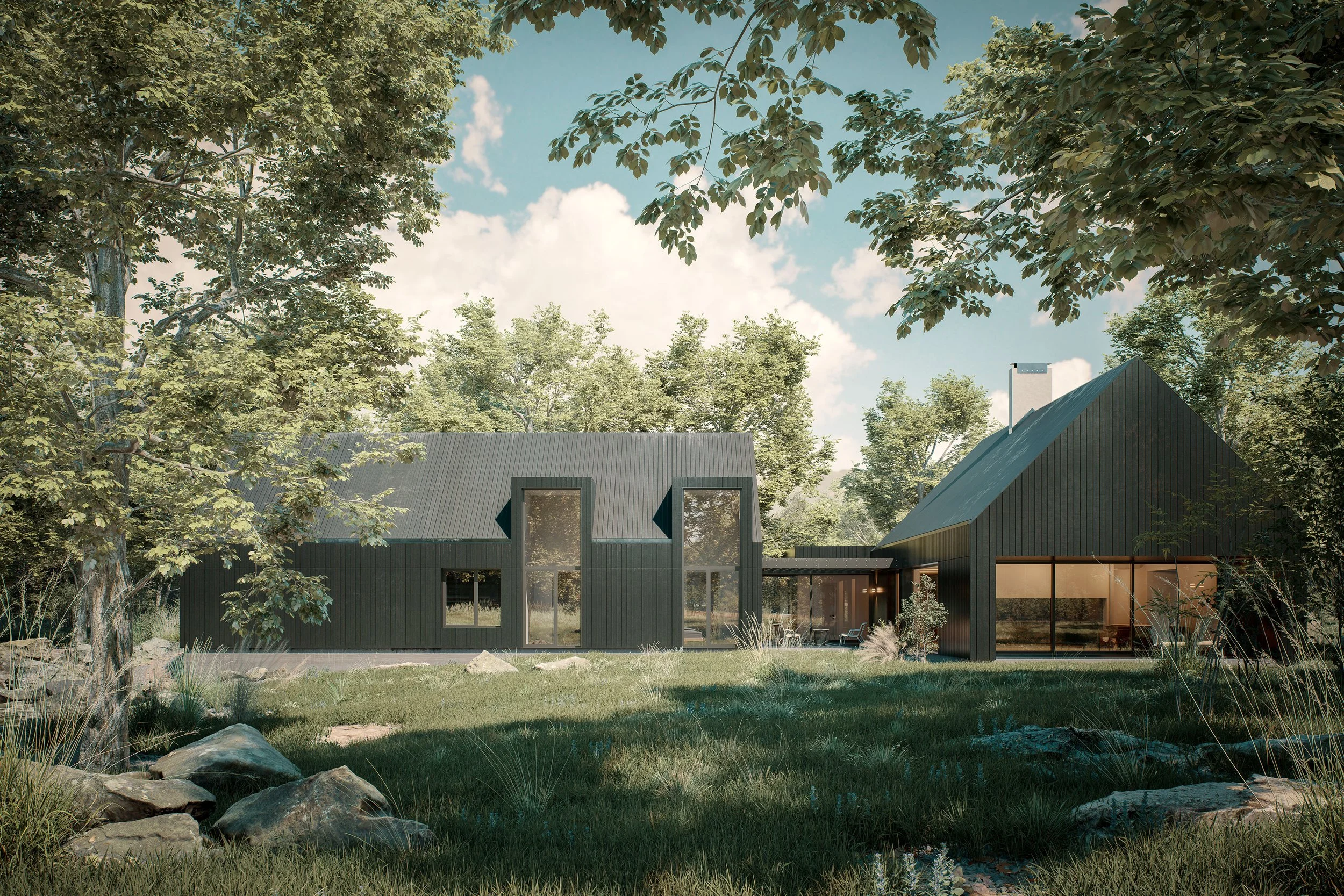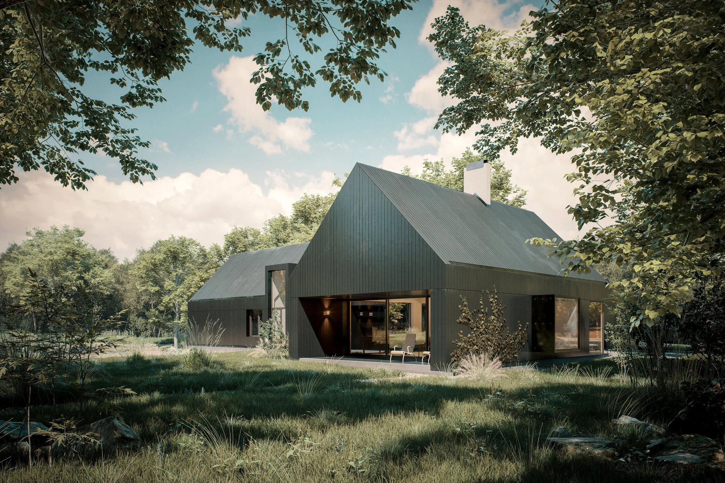 Large windows invite the landscape in, while the dark, vertical cladding allows the house to blend into its surroundings rather than dominate them.
