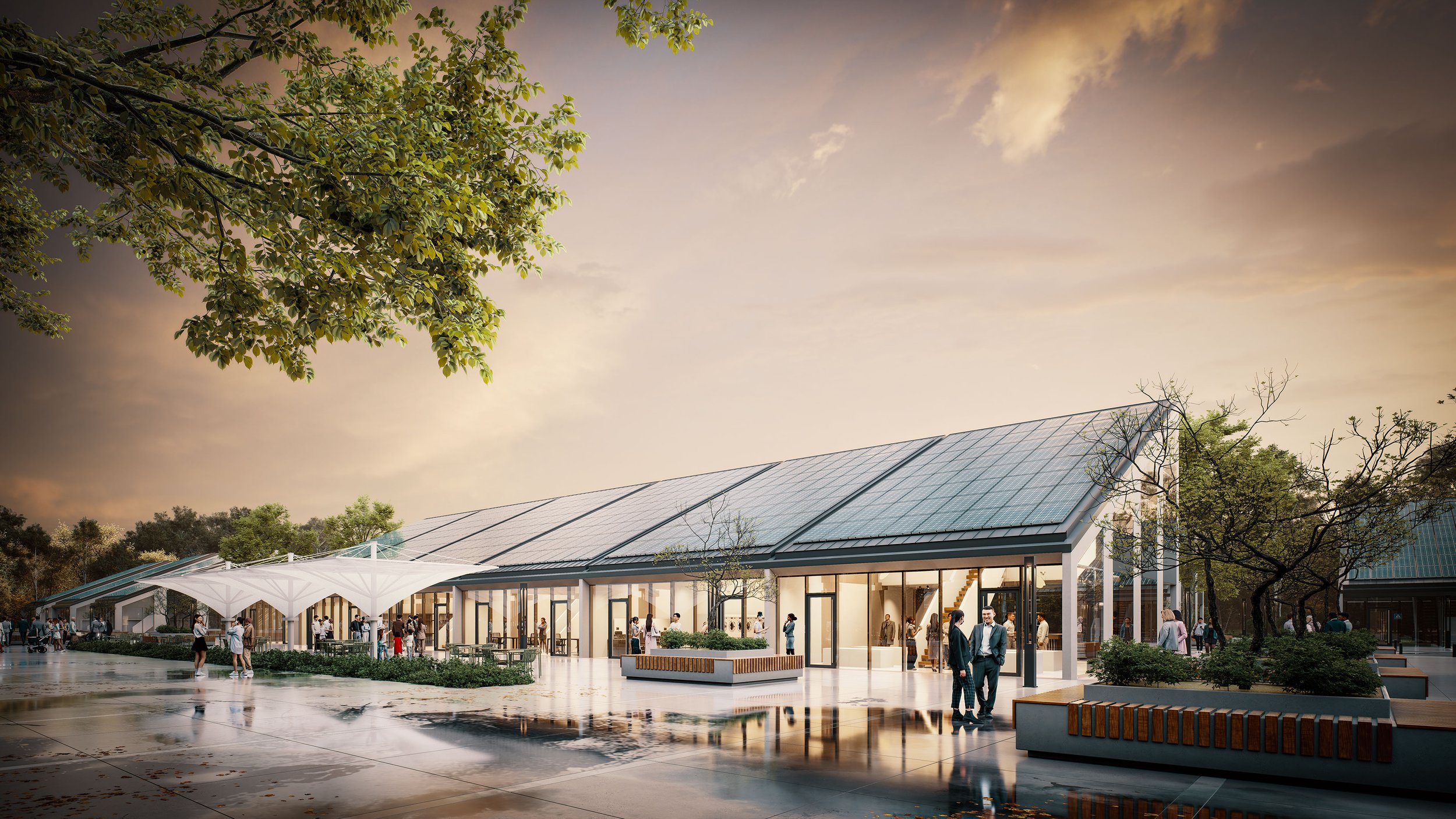 A large array of rooftop solar panels supports energy self-sufficiency, positioning the development as a future-ready hub for local commerce and flexible workspaces.