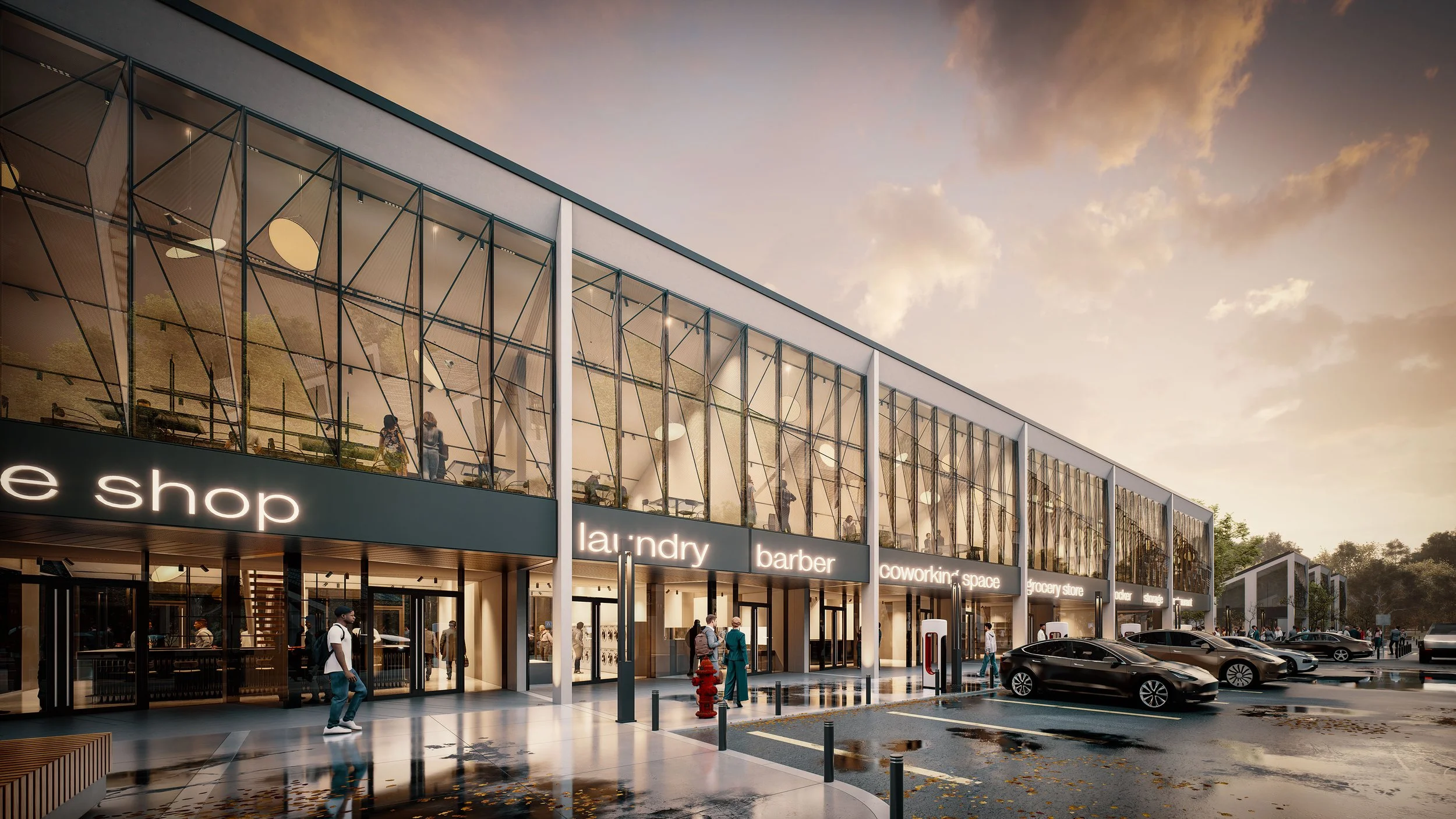 This conceptual design for a strip mall reimagines community retail with durability, sustainability, and adaptability in mind.