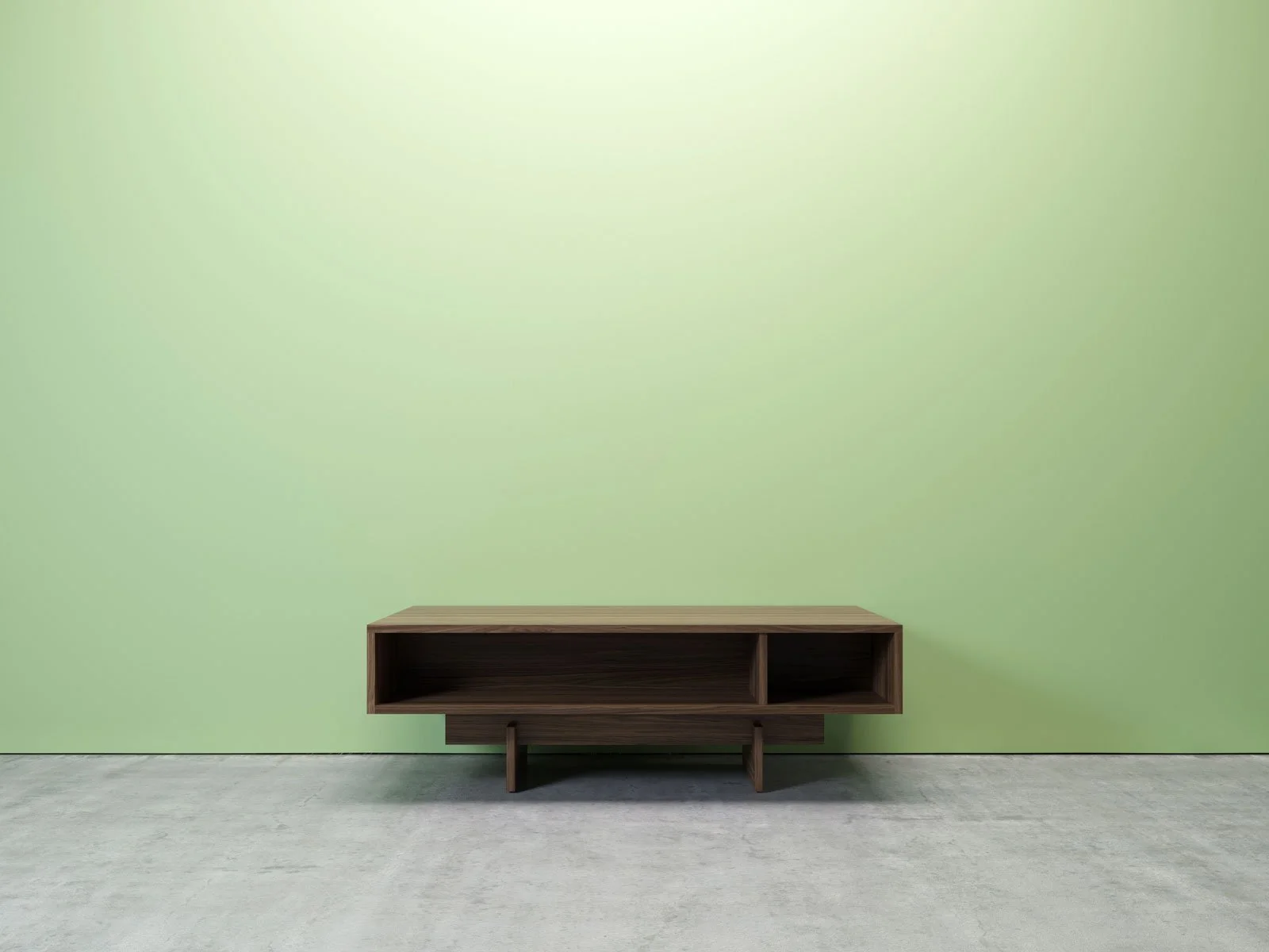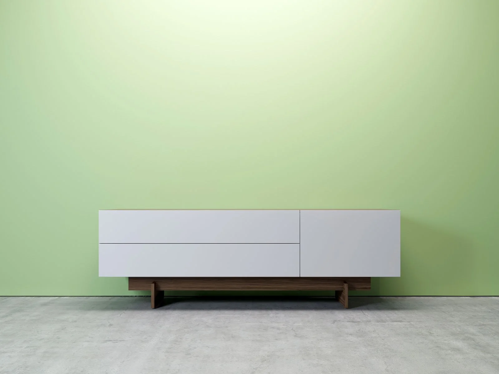 A set of high quality furniture renderings showcasing a cohesive collection of bedroom and living pieces including a platform bed, sideboard, coffee table, and dresser. Designed with a walnut frame and matte white fronts, the collection emphasizes clean geometry, functional storage, and a minimal contemporary look.