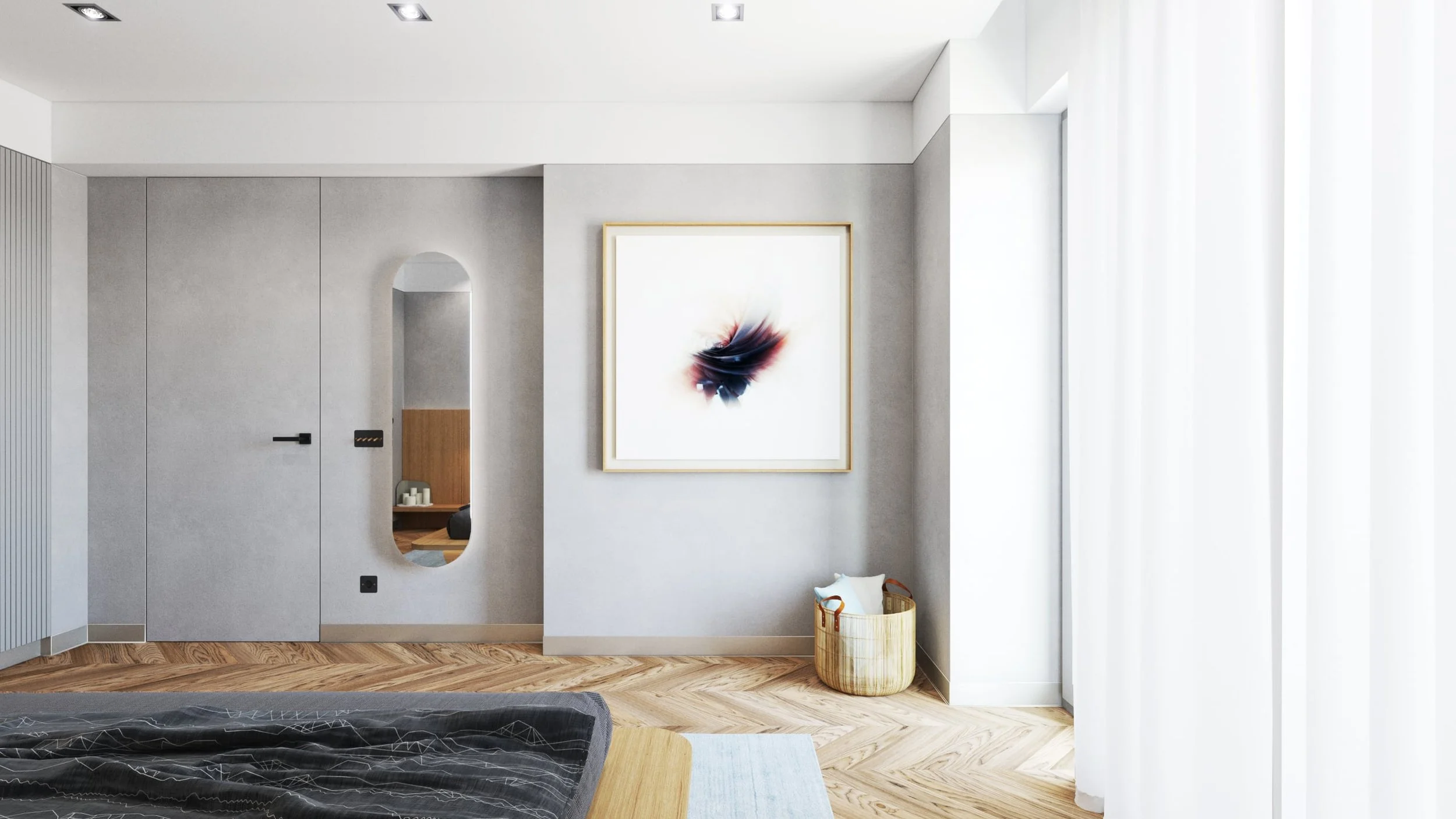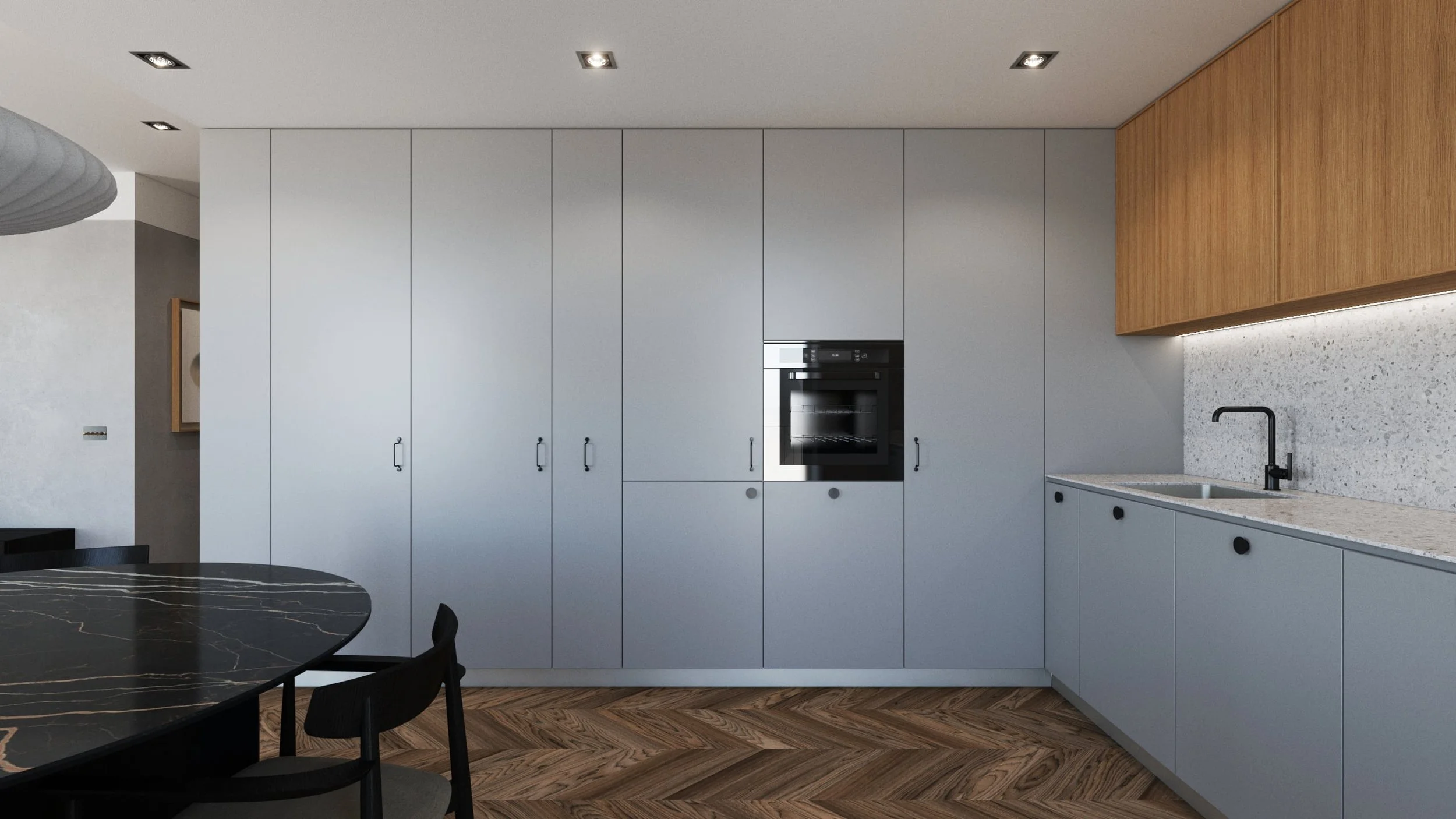 The design aesthetic revolves around a harmonious blend of sleekness and sophistication, characterized by a masterful combination of chevron wood floors, oak, and black wood veneers, and a palette of elegant grey tones.